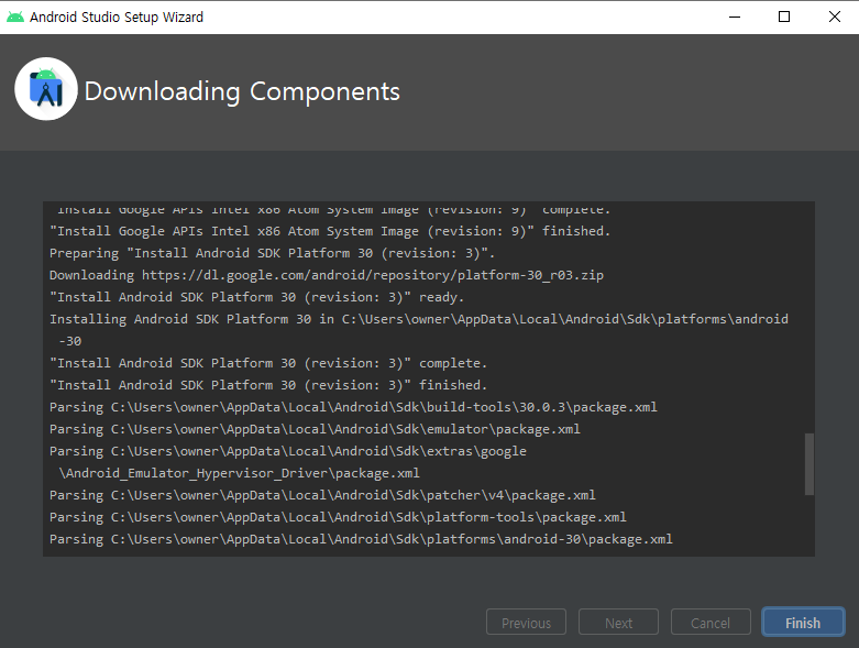 3) 안드로이드 스튜디오 설치: 그냥 일반적인 윈도우 프로그램 설치 프로세스. 시간은 꽤 걸림(약 10분?)