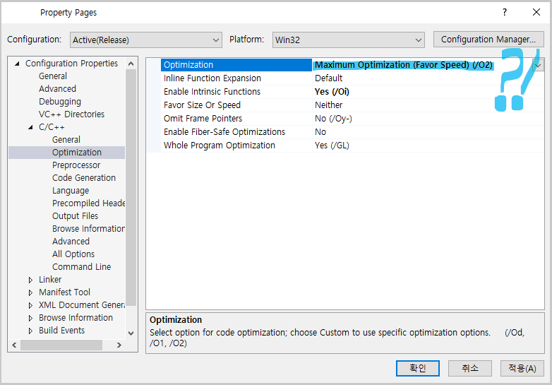 Maximum Optimization (Favor Speed) (/O2) 라고 되어있는 걸 볼 수 있다.